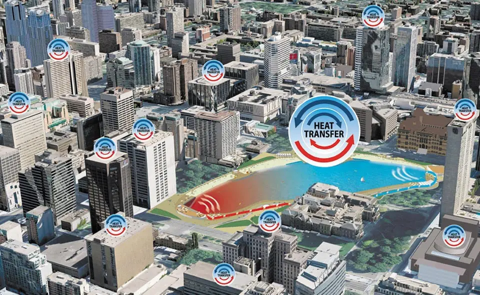 Crystal Lagoons ha desarrollado una tecnología que permite mantener grandes cuerpos de agua con excelente calidad de agua, a muy bajos costos, y que pueden ser construidos cerca de instalaciones residenciales o industriales para proveer un medio de transferencia de calor estable para bombas de calor, entregando aire acondicionado o calefacción a muy bajos costos, reduciendo hasta un 50% el consumo de energía comparado con sistemas convencionales.