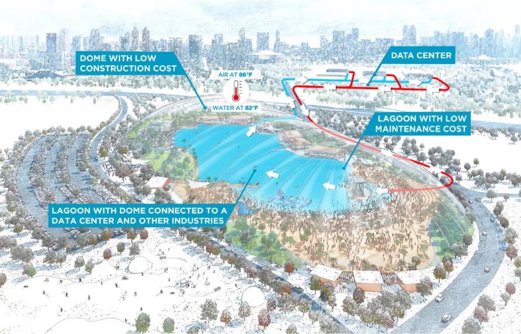 The energy recovered from industrial processes can also be used to heat PAL™ lagoons year-round at no additional cost, using only residual energy. This creates a tropical-style lagoon with hot bathing water and warm air if a dome is incorporated. Thus, the lagoon is not only used for cooling but also opens up a new sustainable business opportunity that allows the community to enjoy beach life and water sports in any climate through ticketed entry to the lagoon.